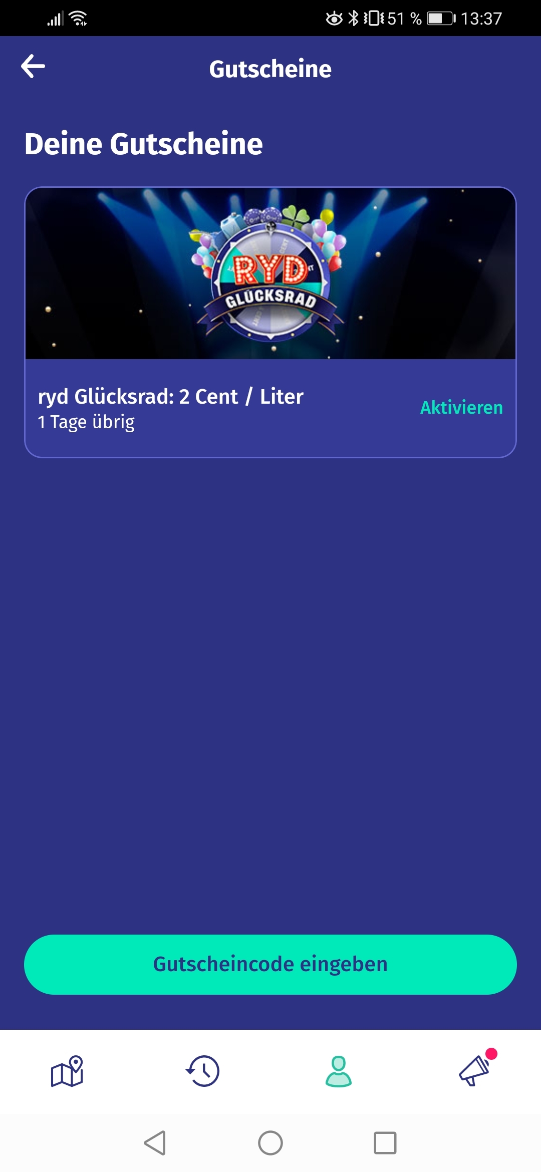 - Landet das Rad auf „Tankrabatt“, wird der Rabatt im Gutschein Wallet hinterlegt. Er muss mit einem Klick aktiviert werden und ist ab 12 Uhr bis zur Drehung des Folgetags gültig.