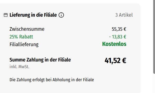Lieferung entweder in die Filiale oder nach Hause!
