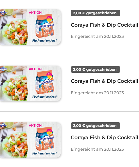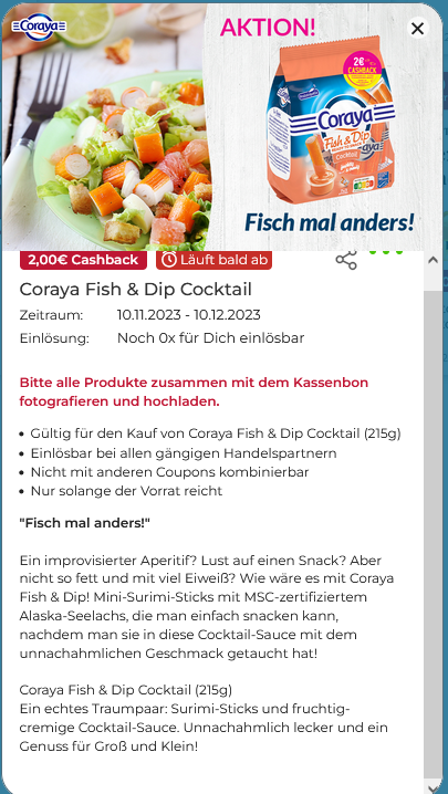 Zwischen 1.10.-15.12.2023 gibt es 2€ Cashback auf Coraya Fish & Dip Surimiprodukte.