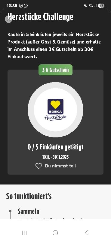 Wenn man im Aktionszeitraum 10.11.-30.11.2025 bei Edeka in 5 Einkäufen je mindestens 1 Produkt der Hausmarke Herzstücke kauft und die Edeka App benutzt, bekommt man einen 3€ Gutschein für einen Einkauf ab 30€ geschenkt (in der Edeka App).