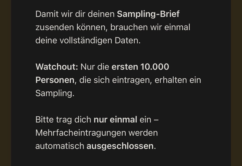 Hey, in den Teilnahmebedingungen heißt es unter Punkt 3.3, dass höchstens 20.000 Samplings versendet werden.