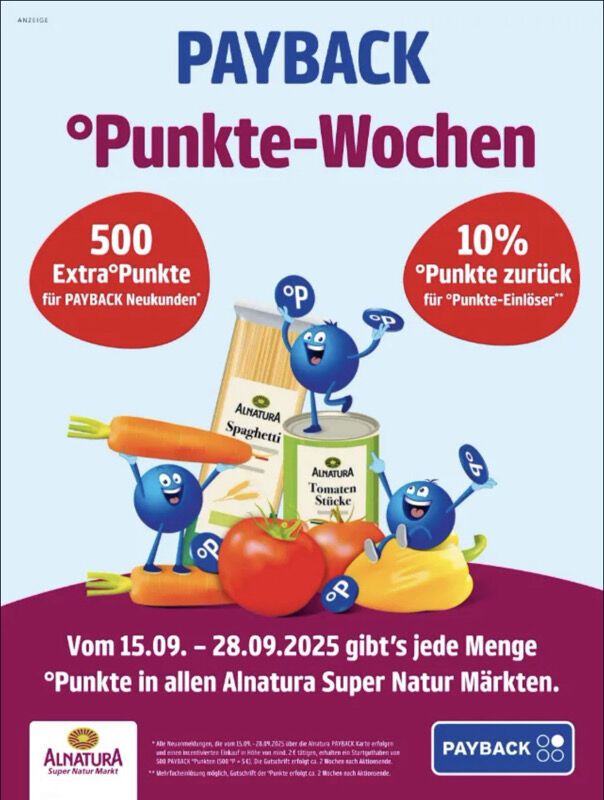 Mit der Payback-Karte sammelt ihr bei jedem Einkauf in den Alnatura-Märkten und bei über 700 PAYBACK Partnern Punkte. Alle Neuanmeldungen über Alnatura zum PAYBACK Programm vom 28. Juli bis 31. August 2025 erhalten ein Startguthaben von 500 PAYBACK-Punkten (500°P = 5 €).