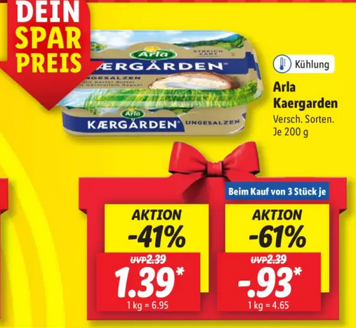 Ab Montag den 11.12.2023 kann man die Butter beim Lidl für nur 93 Cent kaufen, wenn man 3 Stück kauft.