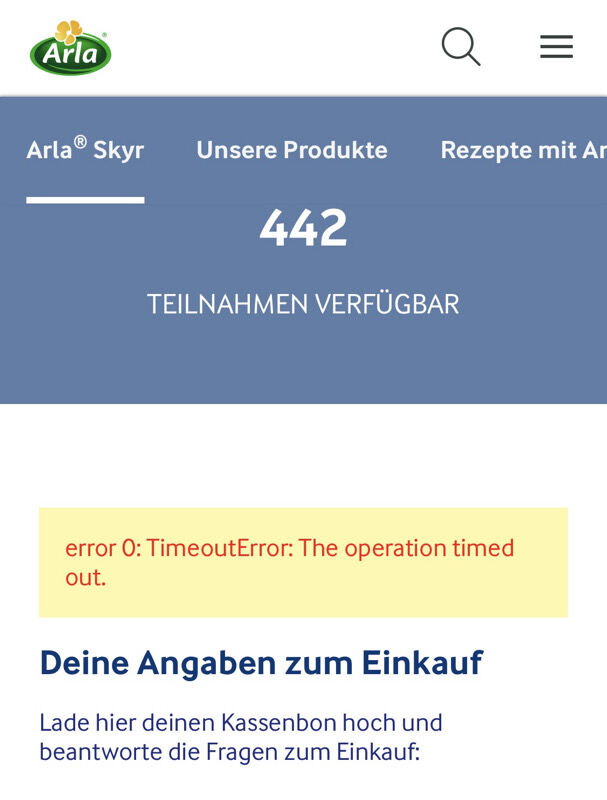 3 Fehlermeldung beachten: Wenn der Fehler weiterhin besteht, versuche es später erneut oder kontaktiere den Support von Arla direkt, um das Problem zu melden.