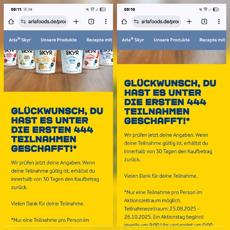 ich habe an Arla geschrieben, das es Probleme gibt. sie haben mir geantwortet und ich konnte meinen Beleg manuell per Mail schicken. Ich bin gespannt ob eine Bestätigung kommt