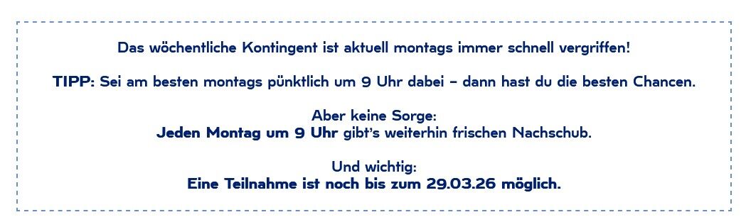 - Gesamtlimit: Die Aktion endet vorzeitig, wenn 60.000 Teilnahmen erreicht sind.