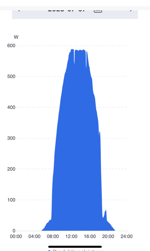 600er mit 740 Wp Panels und suboptimaler Ausrichtung, ab ca. 13 Uhr kommt Schatten vom Dach drauf