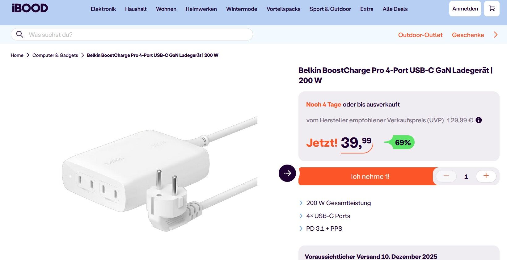 Bei iBOOD ist das Belkin BoostCharge Pro 4-Port-USB-C-GaN-Schnellladegerät (200W) aktuell für 39,99€ + 5,95€ Versand erhältlich.