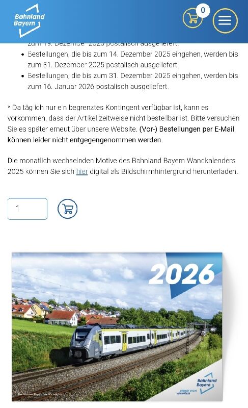 Auch dieses Jahr gibt es wieder den schönen Kalender von Bahnland Bayern. Man kann bis zu 2 Stück bestellen.Einfach runterscrollen bis zum Kalender und Anzahl eintragen.Wenn die Leiste für die Anzahl fehlt, einfach paar Std. soäter wieder versuchen. Bei mir war sie ca.10-13 Uhr zu sehen..Also vermutlich wird vormittags eine bestimmte Anzahl freigegeben.Schnell sein lohnt sich denn er ist schnell vergriffen jedes Jahr.