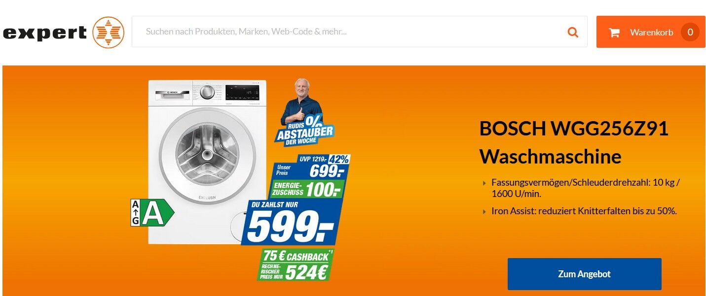 Bei expert bekommt man die BOSCH WGG256Z91 Waschmaschine (10 kg, EEK: A, 1600 U/Min) durch einen 100€ Energiezuschuss zum Preis von 599€ statt 699€ + 79,90€ Speditionslieferung bis zur Verwendungsstelle. Zusätzlich kann man sich nach dem Kauf und der Registrierung auf der Bosch Aktionsseite noch 75€ Cashback für das Gerät zurückholen, wodurch man einen effektiven Gesamtpreis von 603,90€ inkl. Lieferung erhält (siehe Foto in den Beiträgen).