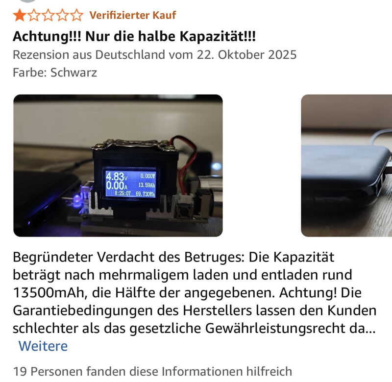 Achtung Warnung : Lest euch bitte auch die 10% negativen 1 Sterne Bewertungen durch. Da Gibt es alles. Halbe Kapazität was auch plausibel ist befindet Dicke. Macht sich halt keiner die Mühe zum Messen. Brandschäden. Aufblähungen usw. Hitzeentwicklung.