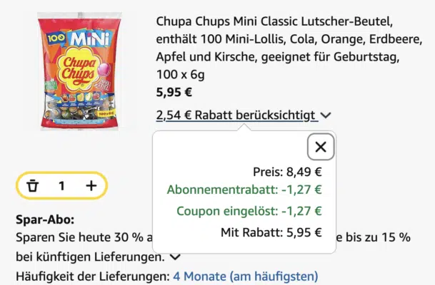 Selbst 8,49€ ohne dem ganzen Hickhack Sparabo-Gedöns ist das ein guter Preis, wenn man bedenkt das der Lolli dann 8,5 €-Cent kostet und im Laden für ca. 50Cent angeboten wird 😉