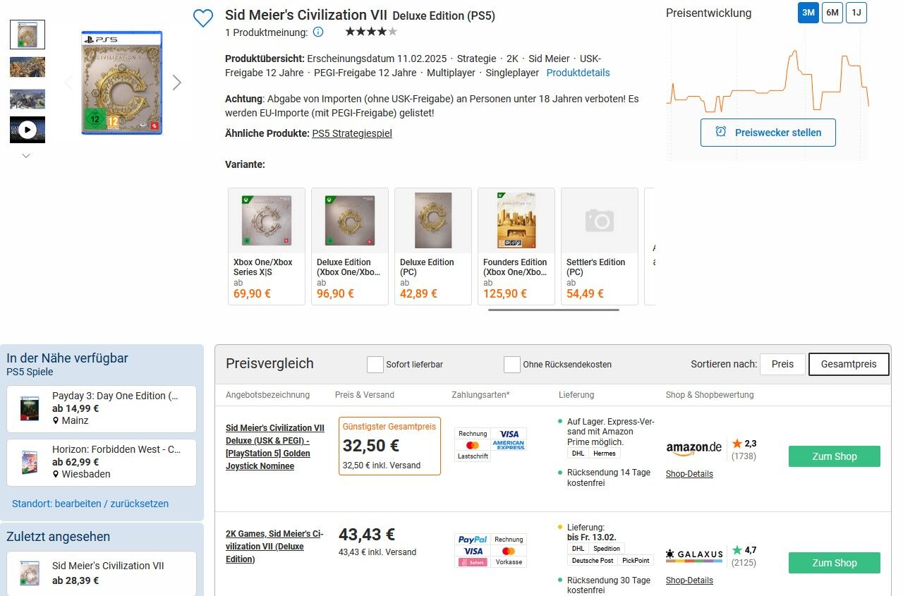 Die Deluxe Edition von Civilization VII ist für die PlayStation 5 bei Amazon aktuell für 32,50€ inkl. Versand im Angebot 😉PVG bei Galaxus 43,43€ inkl. Versand