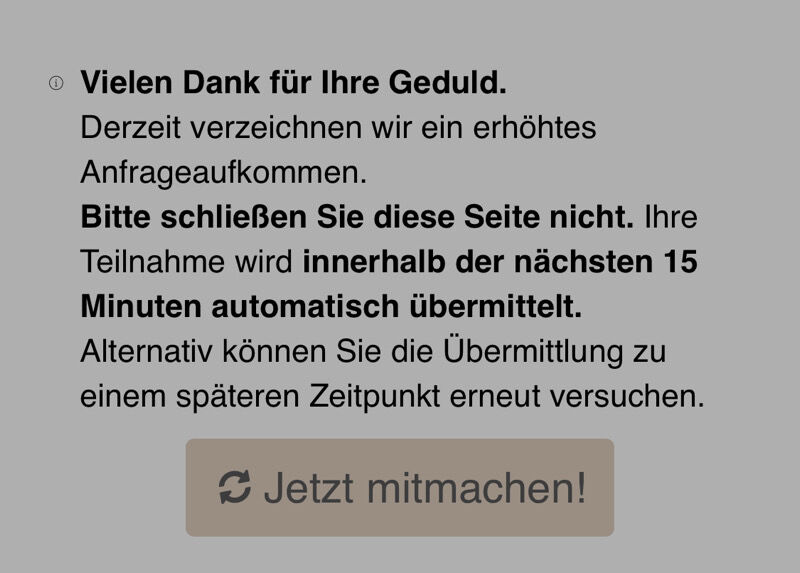Aufgrund der hohen Nachfrage wird das Limit vom 23.09. bin einschließlich 27.09.2025 auf 2.000 Teilnahmen erhöht. Ab dem 28.09.2025 gibt es wieder das reguläre Tageslimit von 1.000.