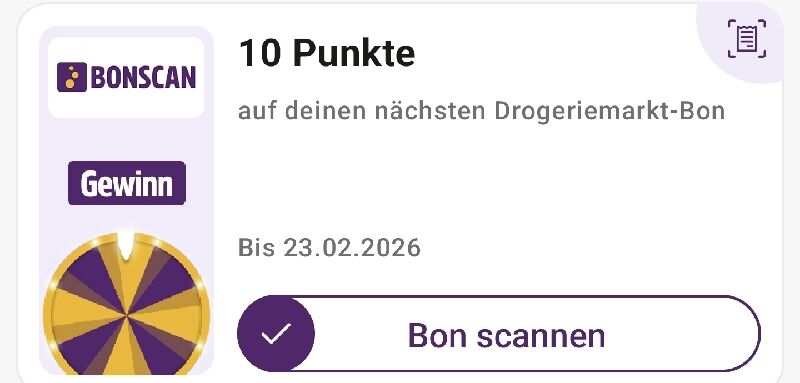 Scheint im Moment auch technische Probleme zu geben, habe heute beim GlĂźcksrad 10 Punkte auf einen Kassenbon erdreht, in meinem Konto erscheinen 10 Punkte fĂźr einen Drogeriebon