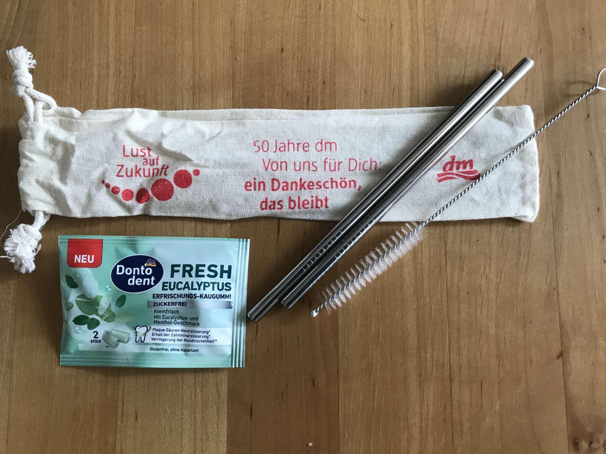 Unser DM hat zusätzlich Körbchen aufgestellt mit Kaugummi-Tütchen und 2 Edelstahltrinkhalmen plus Reinigungsbürstchen im Säckchen (50 Jahre DM-Aktion)