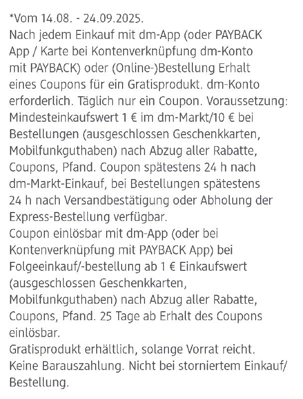 WICHTIG: Die Coupons sind nach dem Erhalt 25 Tage gültig! Ihr könnt euren Coupon beim nächsten dm-Einkauf verwenden.