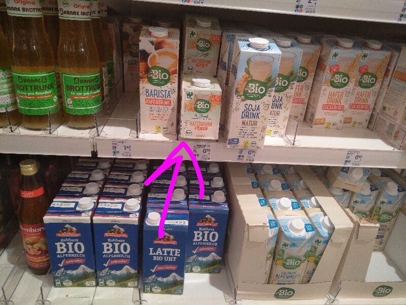 Ich hab heute geschaut, weil ich das so schade fand. Also bei meinem DM ist das zwischen Milch und groĂer Hafermilch.