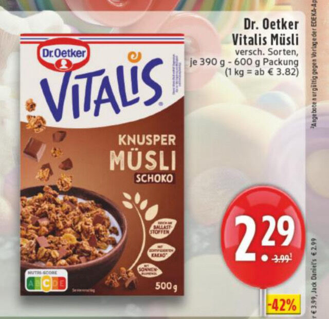 Kauft 2 Packungen Dr. Oetker Vitalis Müsli und erhaltet 2 € Sofortrabatt.