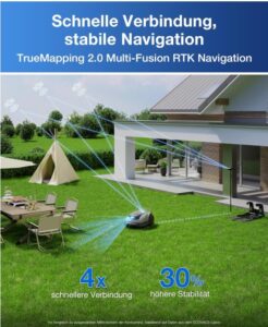 - 【Zuverlässige TrueMapping 2.0 RTK-Navigation】Viermal schneller und 30 % stabiler als andere RTK-Technologien, selbst im Schatten von Bäumen oder Gebäuden. In Gebieten mit schwachem Signal gewährleistet das visuelle Positionierungssystem ein kontinuierliches und präzises Mähen für eine umfassende Rasenpflege.