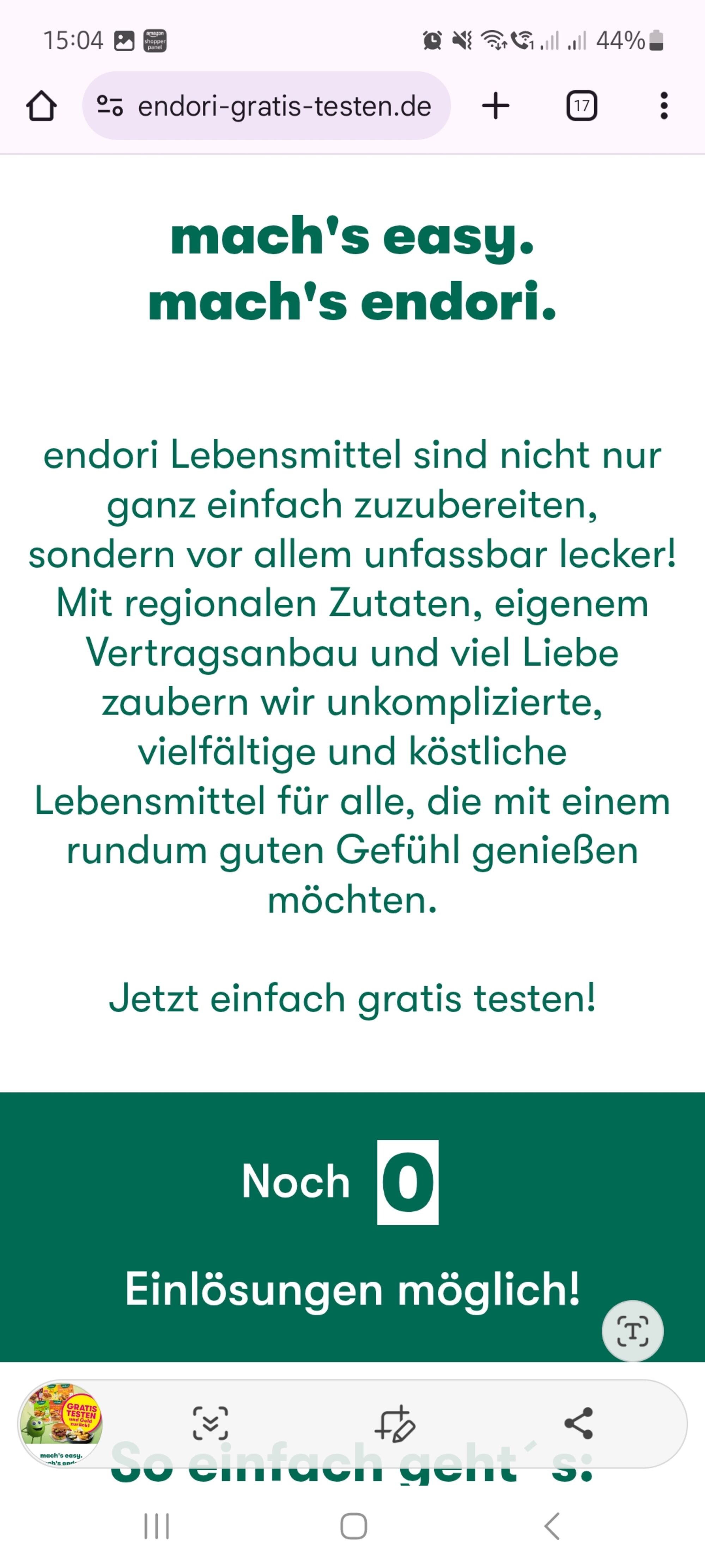 Ihr wĂŒrdet gern mal die pflanzlichen Produkte von endori kennenlernen? Dann ist jetzt der perfekte Zeitpunkt: Im Rahmen der Aktion âGratis testen und Geld zurĂŒckâ könnt ihr endori gratis testen! đ Einfach eines der teilnehmenden endori Produkte im Handel kaufen und den Kaufpreis zurĂŒckerstatten lassen.