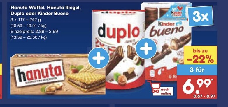 hanuta, hanuta Riegel, kinder Riegel, kinder bueno, kinder Country, duplo und duplo Chocnut.