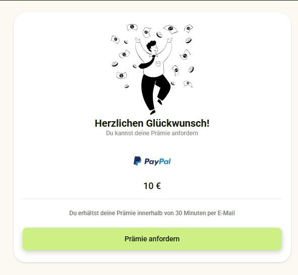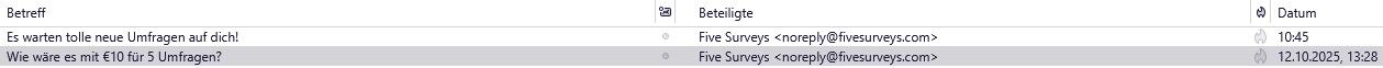 Mal wieder eine doppelte Prämie erhalten (personalisiert per Mail mit dem Betreff „Wie wäre es mit €10 für 5 Umfragen?“ ):