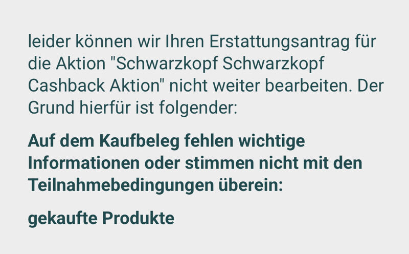 Bei mir kam auch 2x die Ablehnung wegen gekauftes Produkt fehlt auf dem Bon.