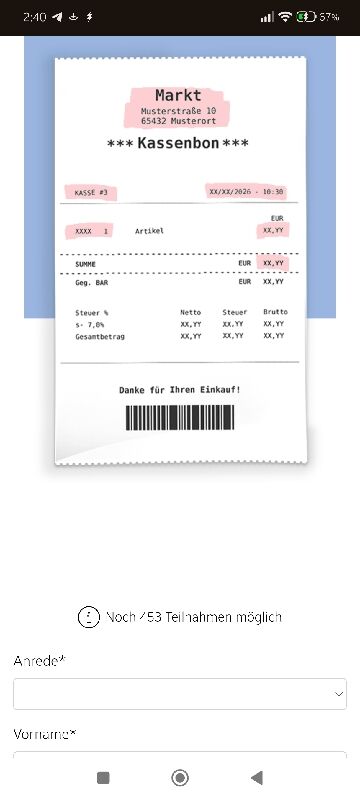 - Ja, laut Teilnahmebedingungen mĂŒssen Kassenbon und das gekaufte Produkt gemeinsam auf einem Foto zu sehen sein.