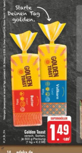 bei Edeka Rhein Ruhr bekommt ihr Golden Toast bis Samstag für 1,49€ (500g) im Angebot.