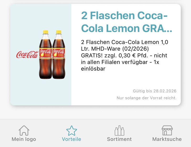 Bei Logo gibt es ab Montag bis 28.02.2026 in der App zwei Flaschen Coca Cola Lemon 1l gratis. Einfach auf den Coupon in der App klicken und mit den zwei Flaschen an der Kasse vorzeigen. Ihr müsst nur Pfand für die zwei Flaschen zahlen .Kein Mindesteinkaufswert, nur einmal pro App. Nur solange der Vorrat reicht