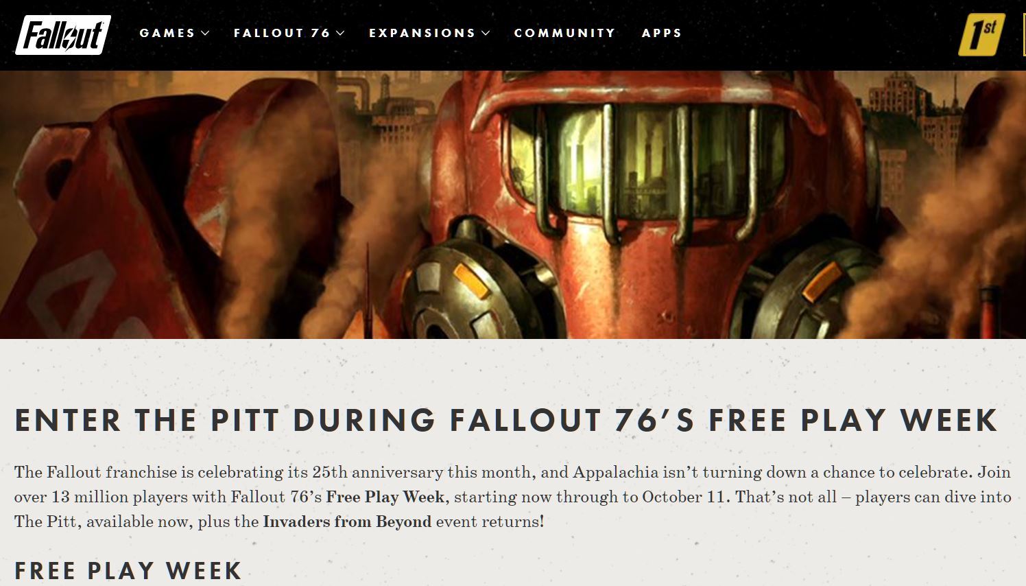 Erkundet während der Free Play Week von Fallout 76, die vom 4. bis 11. Oktober stattfindet, mit euren Freunden das postnukleare Appalachia (und nach dem letzten Expeditions-Update des Spiels The Pitt) ohne zusätzliche Kosten.