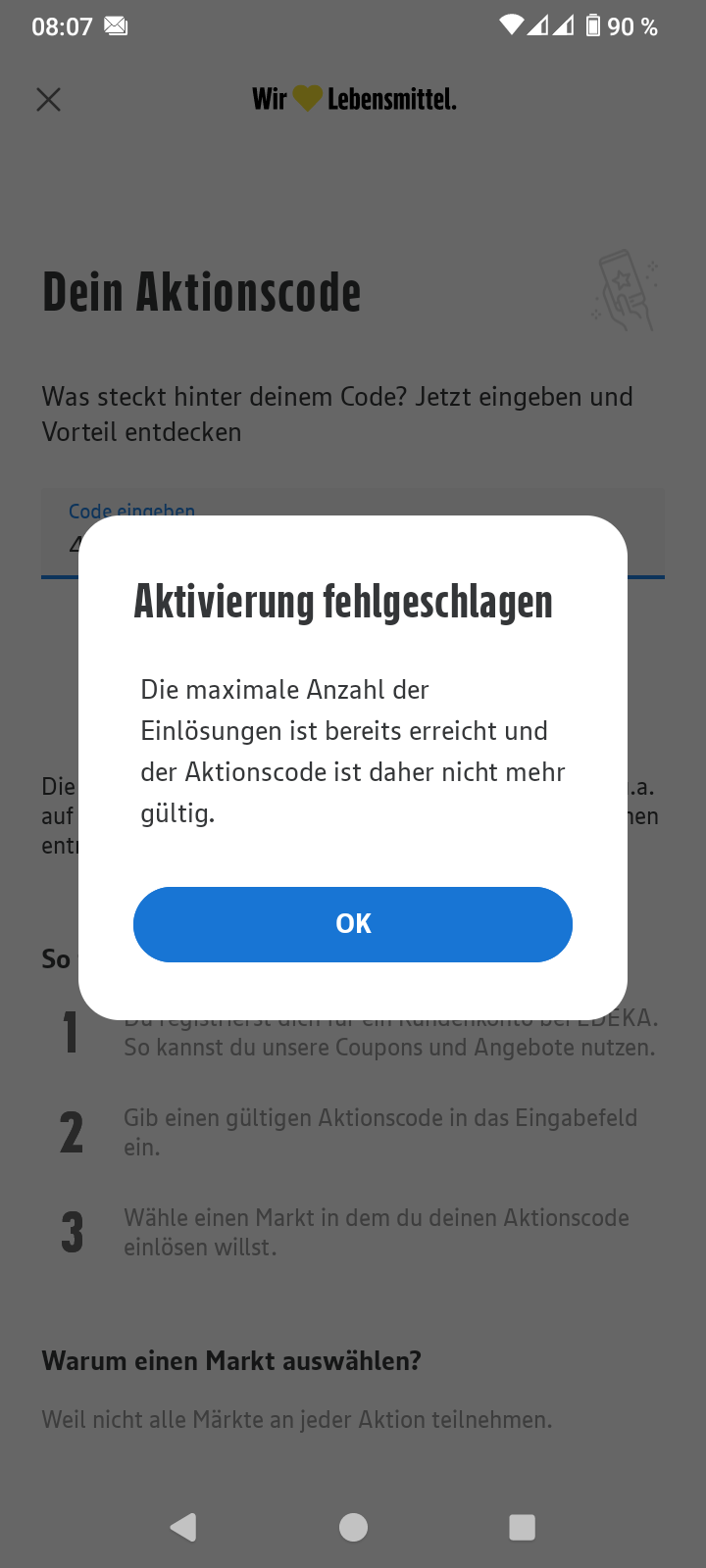 Aber wo kann man den eingeben? Im Feld „Aktionscode“ in der Edeka-App habe ich es versucht und da kommt eine Meldung, der Code sei ungĂŒltig. đ