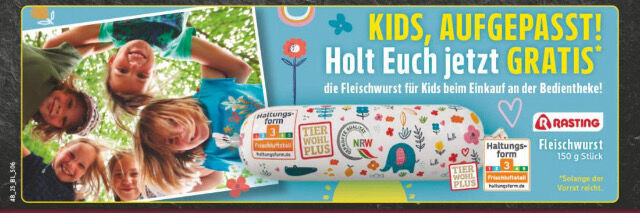 Bei Edeka (auf jeden Fall Südwest 56068) erhalten Kinder beim Einkauf an der Bedientheke eine gratis Fleischwurst (150g) von Rasting.