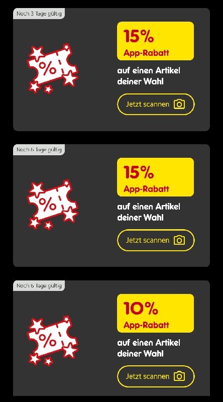 Ich hatte auch schon 2 x 15% coupon zum scannen eines Artikels und als ich nächsten Tag im Laden war war er nicht mehr in der App. Habe an Netto geschrieben aber beide Male keine Antwort bekommen. Ü-Ei habe ich auch schon eingelöst.