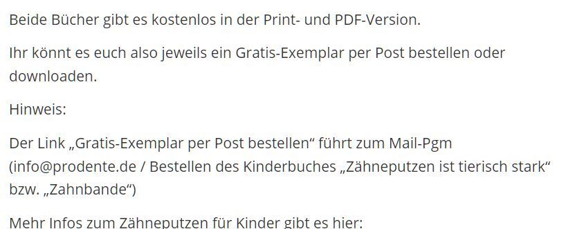 Der Link „Gratis-Exemplar per Post bestellen“ führt zum Mail-Pgm ([email protected] / Bestellen des Kinderbuches „Zähneputzen ist tierisch stark“ bzw. „Zahnbande“)