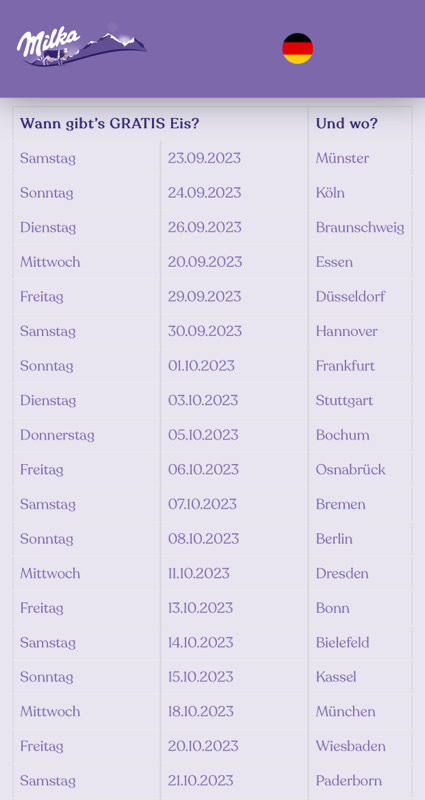 Vom 23.09.23 bis 31.10.2023 könnt ihr euch GRATIS Milka Eis in verschiedenen Städten sichern. Hier mal die Übersicht: