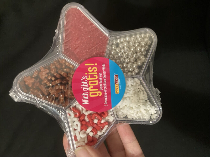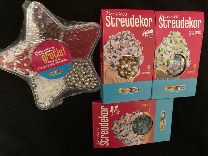 Man bekommt 1 Streuselbox in Sternform gefüllt mit weihnachtlichen Gebäckschmuckzuckerperlen gratis dazu, wenn man 3 decocino Produkte kauft.