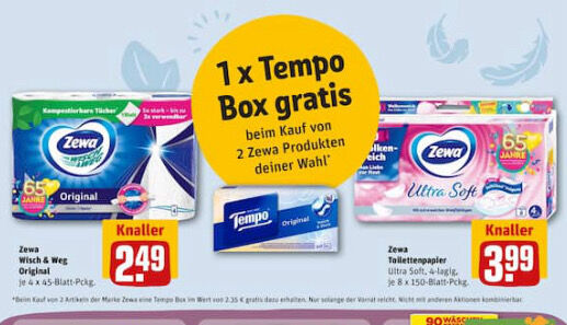 Diese Woche gibt es bei Rewe ein super Angebot, das ihr euch nicht entgehen lassen solltet. Beim Kauf von 2 Zewa Produkten, wie zum Beispiel dem Küchenpapier (aktuell im Angebot für 2,49€), bekommt ihr eine gratis Tempobox im Wert von 2,25€ dazu!