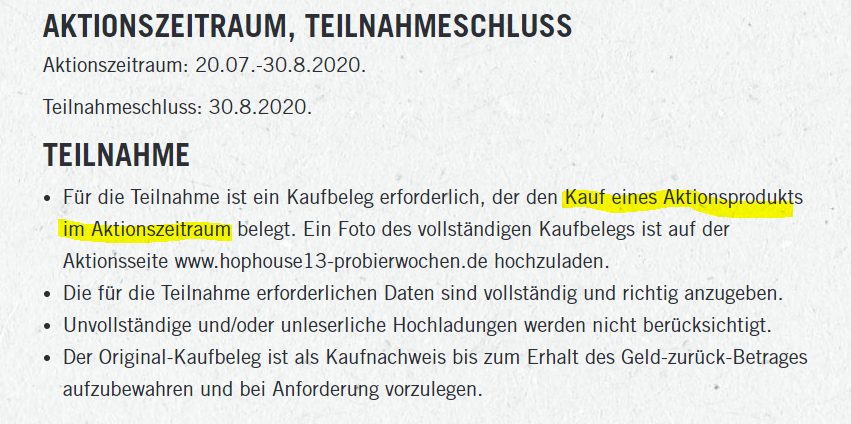 „Bei erfolgreicher Prüfung des Kaufbelegs wird der Kaufpreis (exklusive Pfand) für ein erworbenes Sixpack erstattet (maximal jedoch 5,49 Euro).“