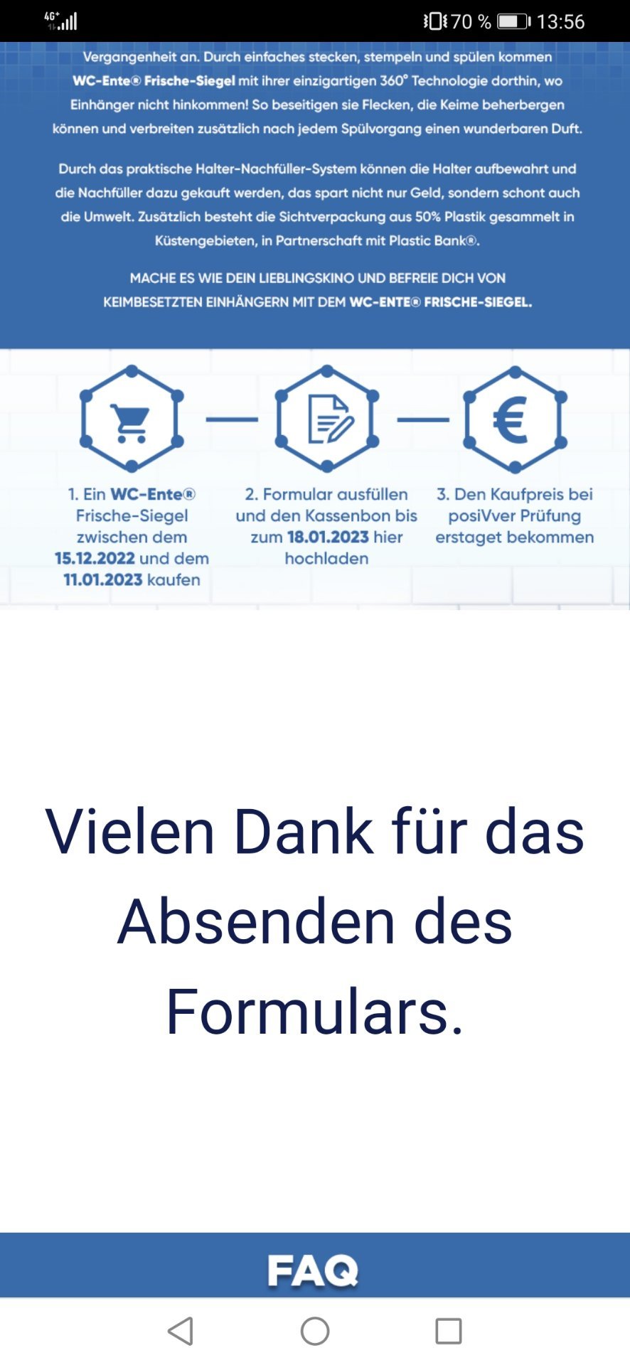 Erstattet wird pro Person (Name, E-Mail, IBAN-Kontoverbindung) maximal der Kaufpreis von 1 Aktionsprodukt (WC-Ente® Frische-Siegel Halter) Höhe von max. 2,79€ (entsprechend der UVP).