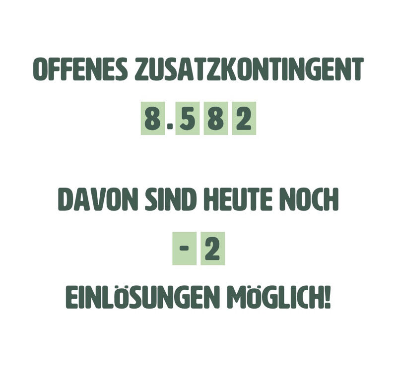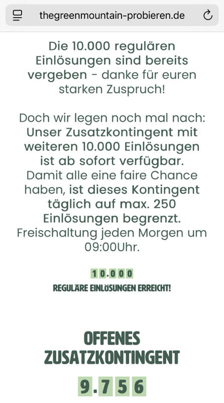 Jetzt ist ein Zusatzkontingent mit weiteren 10.000 Einlösungen verfĂŒgbar! đŸ„ł Damit alle eine faire Chance haben, ist dieses Kontingent tĂ€glich auf max. 250 Einlösungen begrenzt. Die Freischaltung ist jeden Morgen gegen 09:00 Uhr. Danke fĂŒr den Hinweis @rony143 & den Deal @MikeNils. Euer Georg