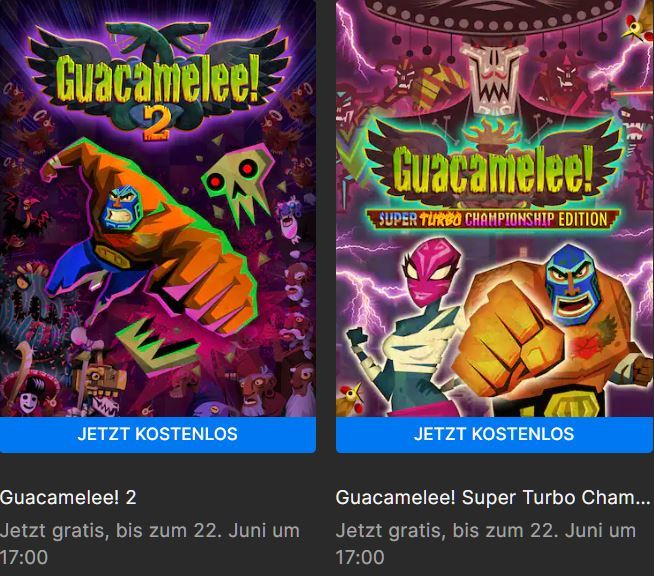 Ab 17 Uhr geht’s los und ihr könnt euch bei Epic ihr Guacamelee Super Turbo Championship Edition und Guacamelee 2 gratis sichern! Laut IsThereAnyDeal kosten die Spiele sonst 5€ und 12€. Bei inoffiziellen Resellern sind sie natürlich aber auch günstiger zu haben. Egal, gratis ist gratis! Viel Spaß! Danke für den Deal @krofisch! Euer Benji