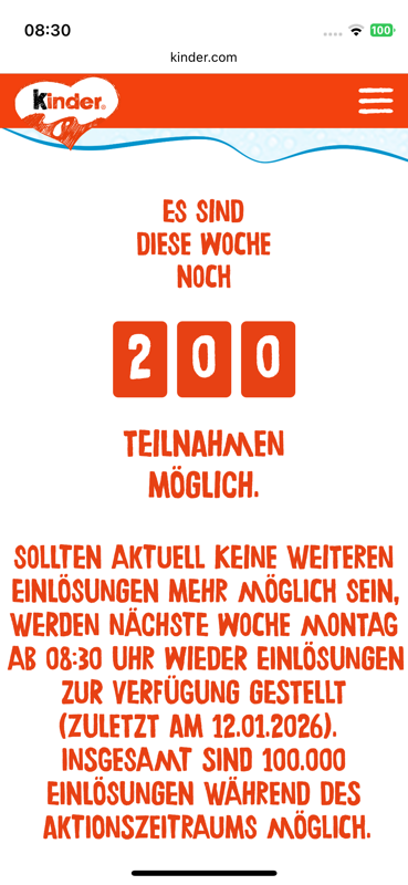 @DealDoktor (Nils): Hallo Nils, es geht nicht um die Anzahl, sondern darum, dass seit Wochen (lies die Kommentare hier drüber bitte) die Mehrheit der Dealisten technisch nicht durchkommt! Mal kommt 404, mal eine Fehlermeldung von Ferrero, mal ist die Seite komplett offline. Das ist der Punkt. 500 Freigaben um 08:30 sind machbar, wenn man pünktlich am PC sitzt, aber eben nur, wenn die Seite technisch auch funktioniert. Das ist offenbar seit Oktober nicht der Fall.