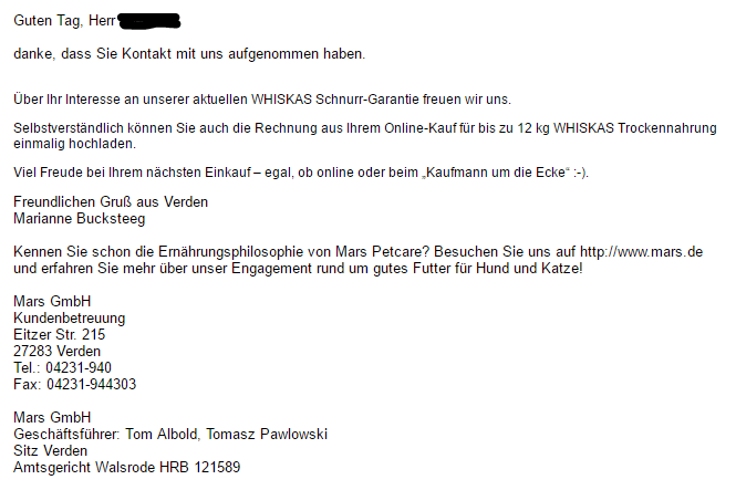 „vielen Dank für Ihre Teilnahme an der WHISKAS® Schnurr-Garantie!