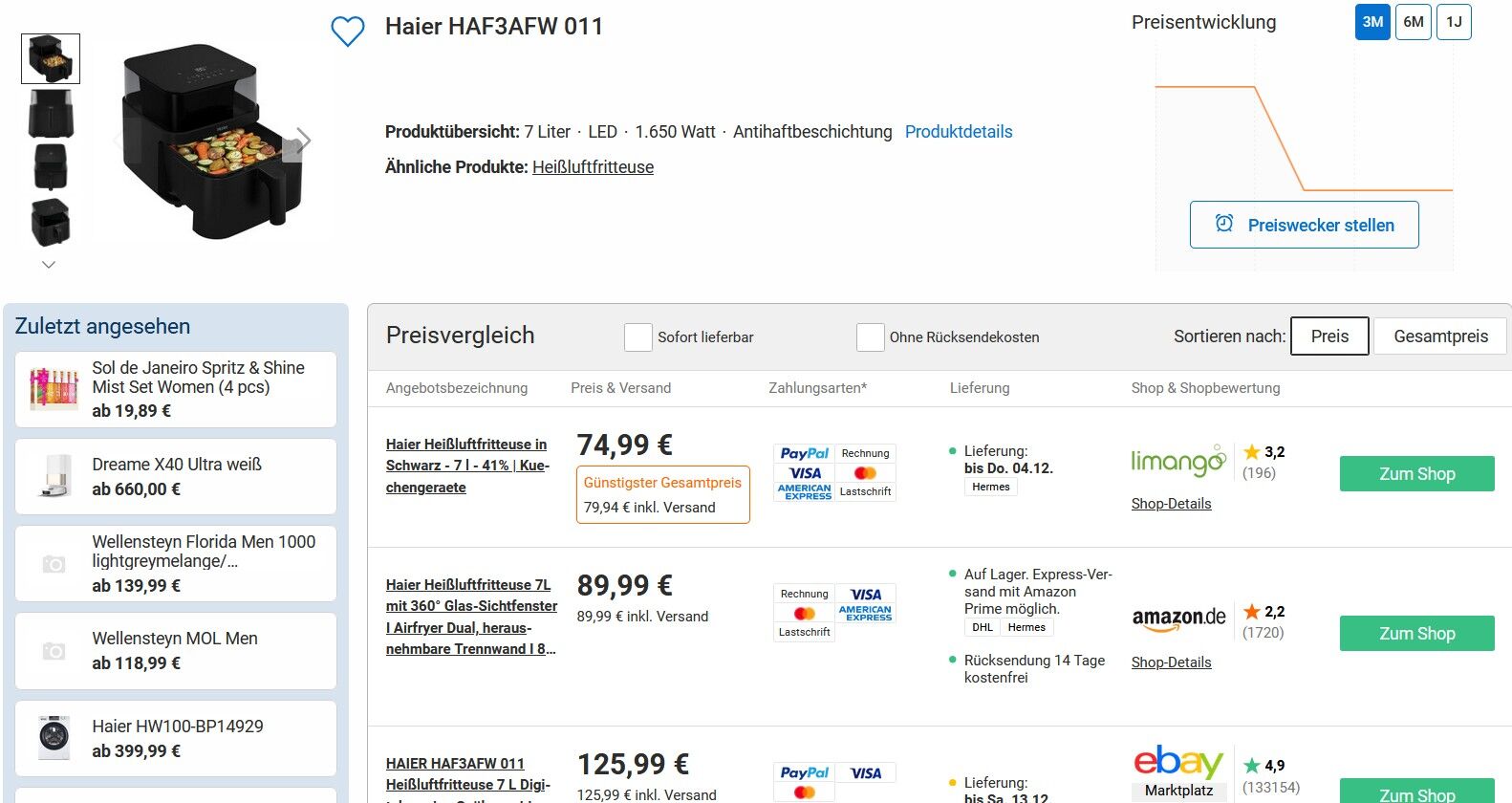 Die Haier 8-in-1 Heißluftfritteuse mit 7 L Volumen und 360° Sichtfenster ist ebenfalls bei limango mit 74,99€ (+ 4,95€ Versand) günstiger als bei Amazon für 89,99€ (inkl. Versand). Deal ist bereits bearbeitet 😉