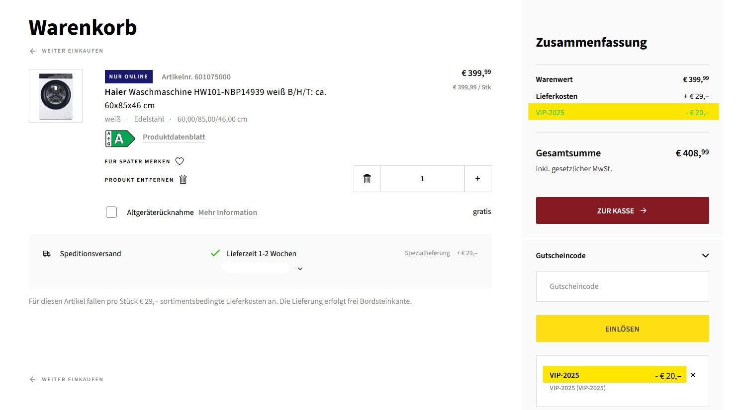 Die Haier Waschmaschine ist bei POCO aktuell mit einem 20€ Gutschein für 408,99€ inkl. Lieferung zu bekommen. Deal ist entsprechend überarbeitet 😉