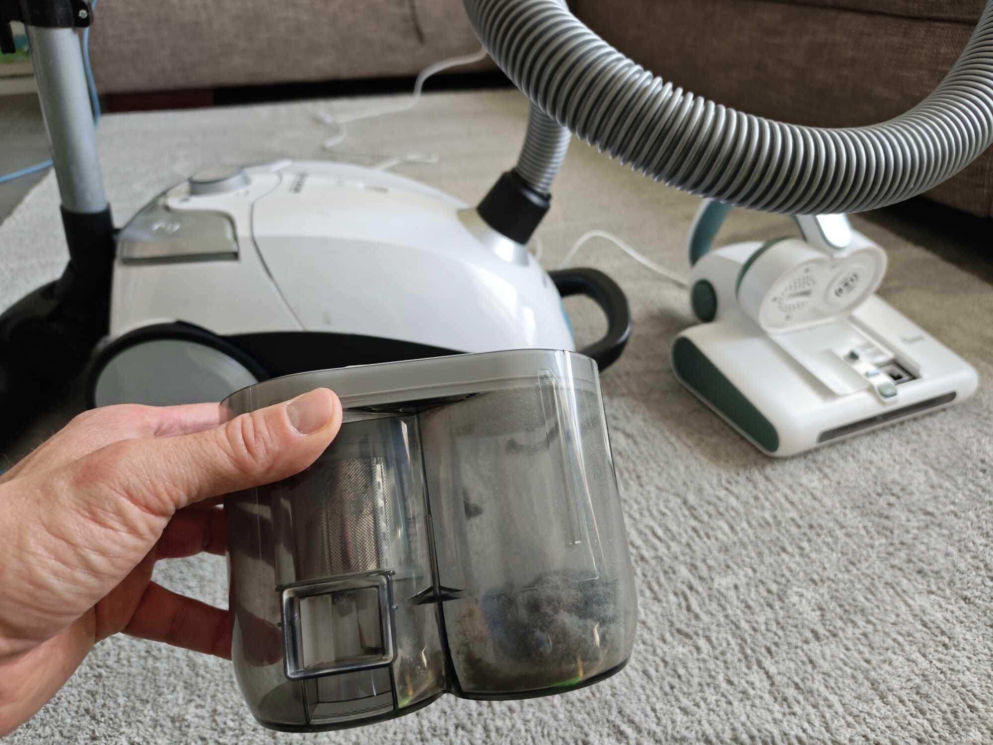 Ich hab gestern meinen Wohnzimmerteppich per Saugroboter und heute mit einem Staubsauger abgesaugt. Heute bin ich mit dem Hoover Matratzensauger nochmal drüber und bin erstaunt/erschrocken wieviel der nochmal rausgeholt hat. Das Ergebnis ist natürlich auch ein Stück weit vom vorherigen Arbeitsmaterial zum Saugen abhängig.