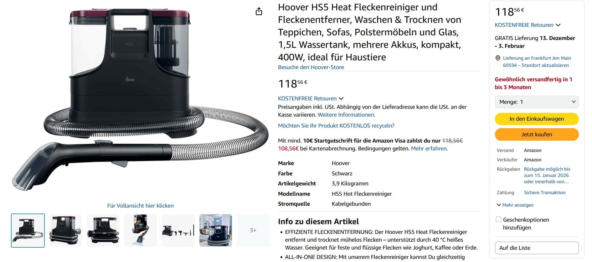 Bei Amazon ist der neue Hoover Waschsauger HS5 Heat Fleckenreiniger und Fleckenentferner mit Warmwasser (HS530) zum Preis von 118,56€ inkl. Versand vorbestellbar. Gewöhnlich versandfertig in 1 bis 3 Monaten.