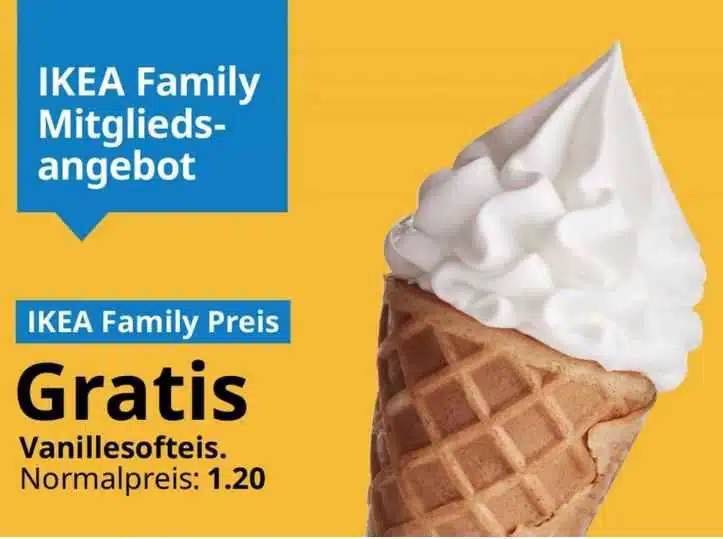 IKEA Family Mitglieder erhalten im gesamten August 2023 ein gratis Vanillesofteis zu jedem Einkauf bei IKEA Kaiserslautern.